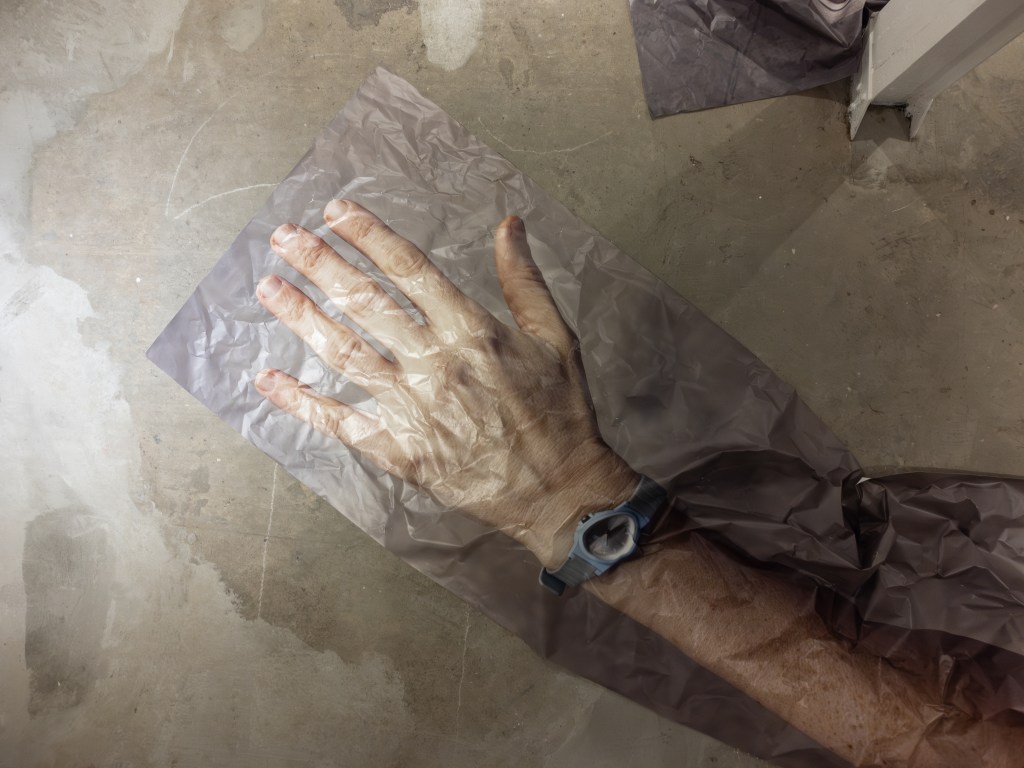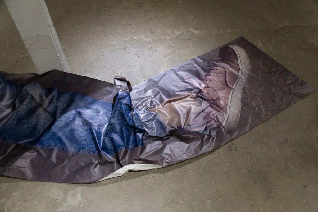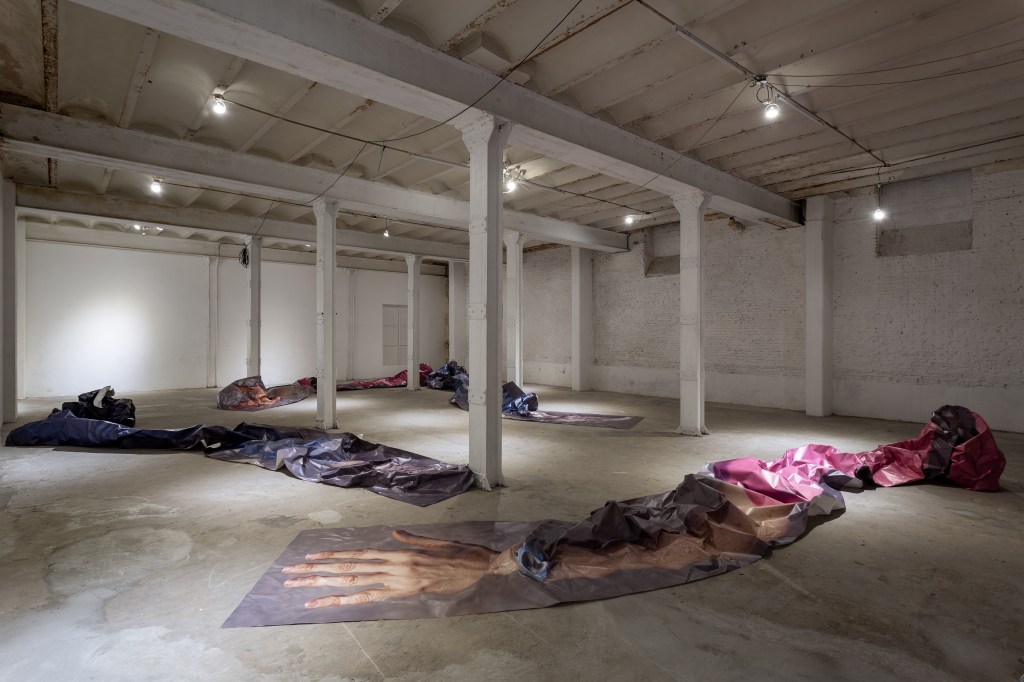 Cuatro imágenes de 2 brazos y 2 piernas, de alrededor de 10 metros cada una, se distribuyen sobre el piso de un subsuelo. Algo hace ruido, el tamaño que tienen no corresponde a escala, se encuentran hiperextendidos, como si se hubiesen estirado más de la cuenta, más de lo posible. Y luego abollado. Son bollos que se estiran y se contraen formando ondulaciones, saliendo por momentos del plano para alcanzar el espacio. Cuatro piezas clave trabaja sobre la supervivencia.